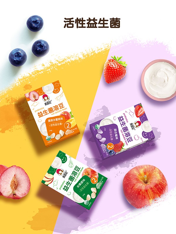 果蔬妃益生菌溶豆,有水果原味、混合莓味、黄桃水蜜桃味,共三种口味,精选原料,融合水果汁,口感绵软醇香,入口易化,适合六个月以上的小朋友作为零食!