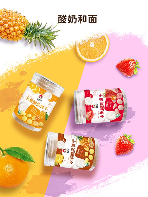 果蔬妃水果酸奶饼干,创新工艺,将酸奶、果汁融入饼干,营养和口感层次更加丰富。独立包装,口感与营养的完美搭配,更有菠萝味、草莓味、香橙味等多种口味,随心选择。