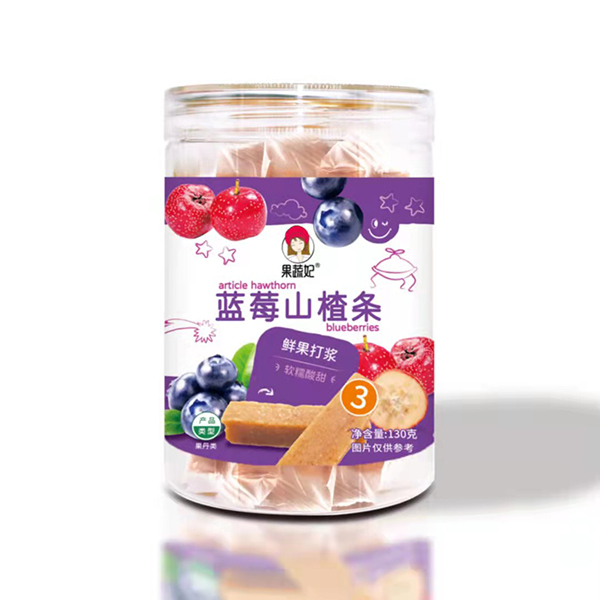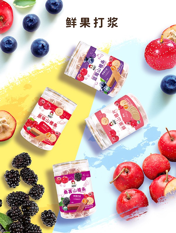 果蔬妃原汁山楂,原料十分简单,将新鲜山楂蒸熟后去籽,然后添加鲜果打浆的苹果、蓝莓和桑葚等,烘烤成型后切块,独立包装保持水分,最终得到帮助宝宝开胃消食、软糯可口的果蔬山楂!