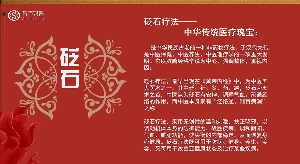 东方妈妈以中医辨证施治,中医砭石疗法为技术核心,旗下设有产后复元商业连锁管理中心、产后复元技术研究院、产后复元技术培训中心,以及产后复元直营门店系统等。