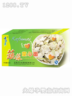 卡夫麦儿童营养童心面是石家庄卡夫麦食品有限公司推出的面条辅食产品,采用麦芯粉和新鲜的蔬菜汁,经过十几道特殊工艺精制而成,绿色天然,滑软可口,面体容易吸收水分,易煮易消化。