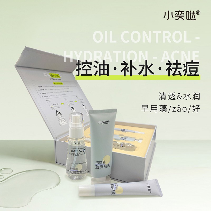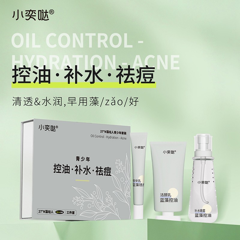 小奕哒青少年蓝藻控油补水祛痘三件套,包含:蓝藻控油洁颜乳+蓝藻控油补水喷雾+蓝藻祛痘精华乳,控油、补水、祛痘,清透水润。