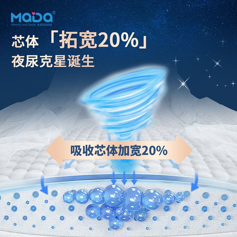 MaDa芯大系列裤型婴儿纸尿裤,芯大20%,不漏好安心。薄若蝉翼,隔湿透气,泡点触肤,干爽舒适,云朵腰围,柔软不勒,芯体加宽,瞬吸瞬干。