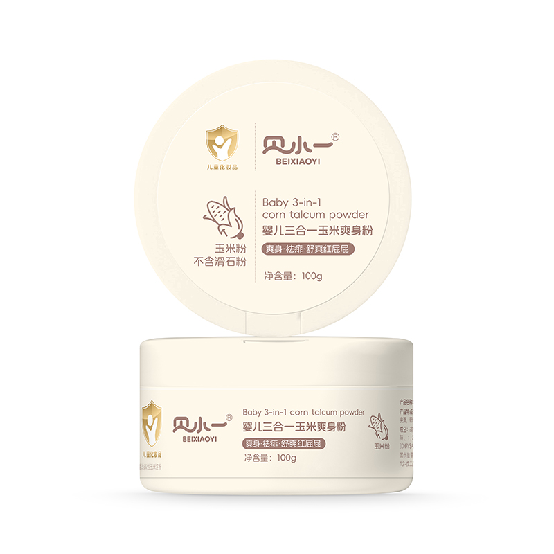 贝小一婴儿三合一玉米爽身粉,品质更放心。精选多重植萃,野菊花提取物,舒缓安抚;薄荷醇,清凉舒爽;冰片,温和舒缓;玉米淀粉,亲肤干爽。不含滑石粉,品质更放心。爽身+祛痱+舒爽红屁屁,三重呵护,守护娇嫩肌肤。