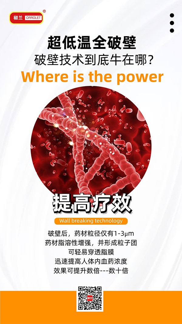 超低温全破壁技术是一种国际尖端超微物理处理技术。在-40°c低温条件下,将原生药材完全脱水冻干,使药材的细胞结构发生崩解。然后利用电子束冲击药材,同时利用电磁震荡的交互作用,将药材进行超微破壁粉碎,确保药材细胞破壁率99%以上。经过纳米技术处理后,药材粒径只有1-3μm,使脂溶性增强,并形成粒子团,可轻易穿过脂膜,迅速提高人体内血药浓度,效果可提升数倍----数十倍!