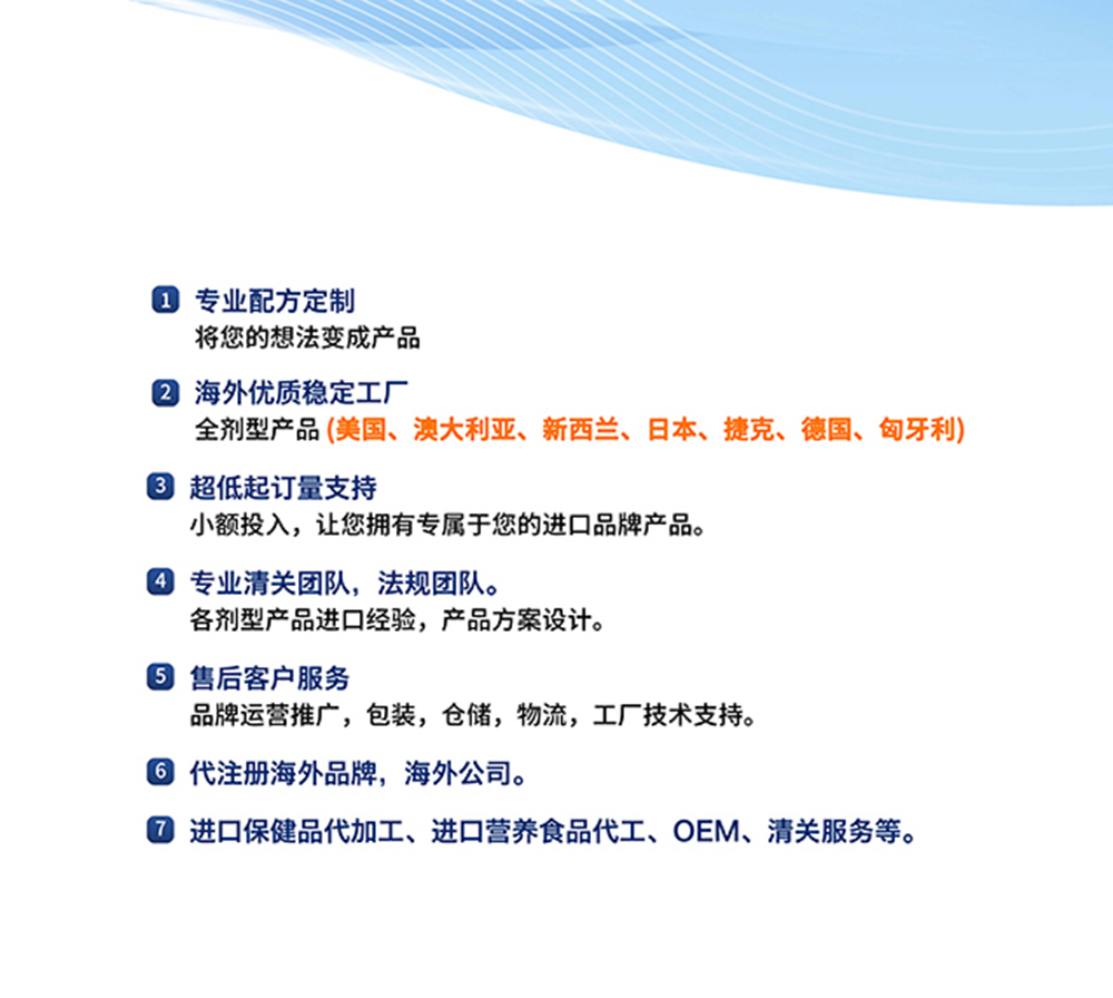 7、进口保健品代加工、进口营养食品代工、OEM、清关服务等。